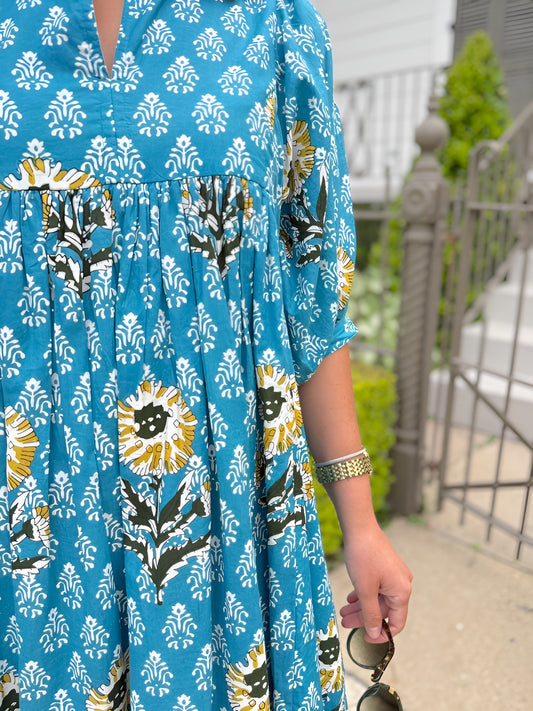 Meg Midi in Butter & Pink Blockprint